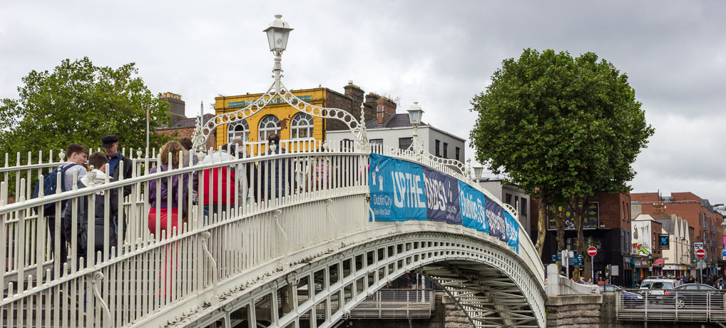 Nächster Halt auf meinem Weg entlang des Flusses war die Ha’Penny Bridge, Dublins Schönste Brücke. Die Ha’Penny Bridge ist nicht nur die Schönste, sondern hat auch eine Geschichte. An der Stelle, an der heute die Ha’Penny Bridge Fußgänger vom einen zum anderen Ufer Seite bringt, gab es früher nur eine Fähre. Da sich die Fähren in einem sehr schlechten Zustand befanden, bekam der Betreiber der Schiffe, William Walsh, eine Auflage vom Staat, die Schiffe entweder zu erneuern oder eine Brücke zu errichten. William Walsh entschied sich für Letzteres. Der Vertrag zwischen Stadt und William Walsh enthielt jedoch eine gemeine Klausel: