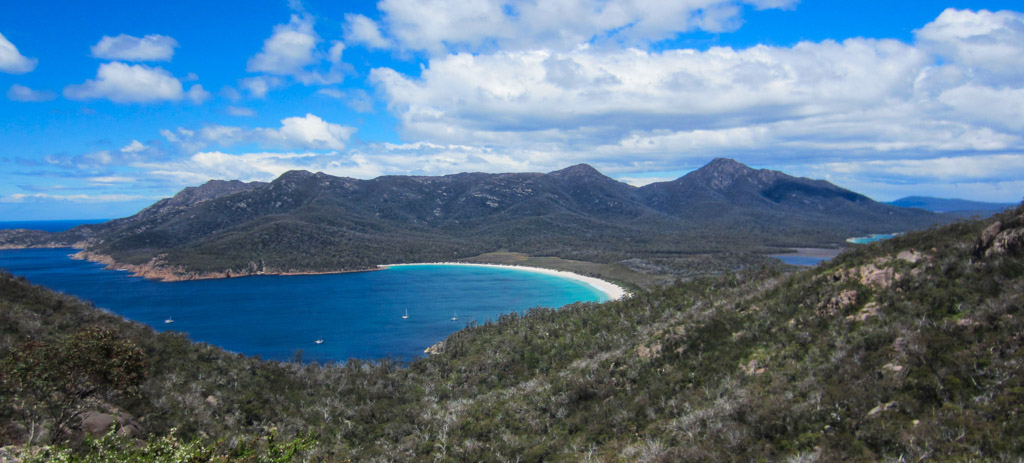 Der Blick auf die Wineglass Bay vom Aussichtspunkt war der Wahnsinn, der Weg hoch hatte sich gelohnt und unten am Strand zu campen war noch vielversprechender.